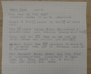 we’ll head up tHighway 1, make our way over to Highway 9, hit Highway 35. We’ll stop at Alice’s Restaurant for Lunch and afterwards head down to La Honda and then back on Highway 1 to home.